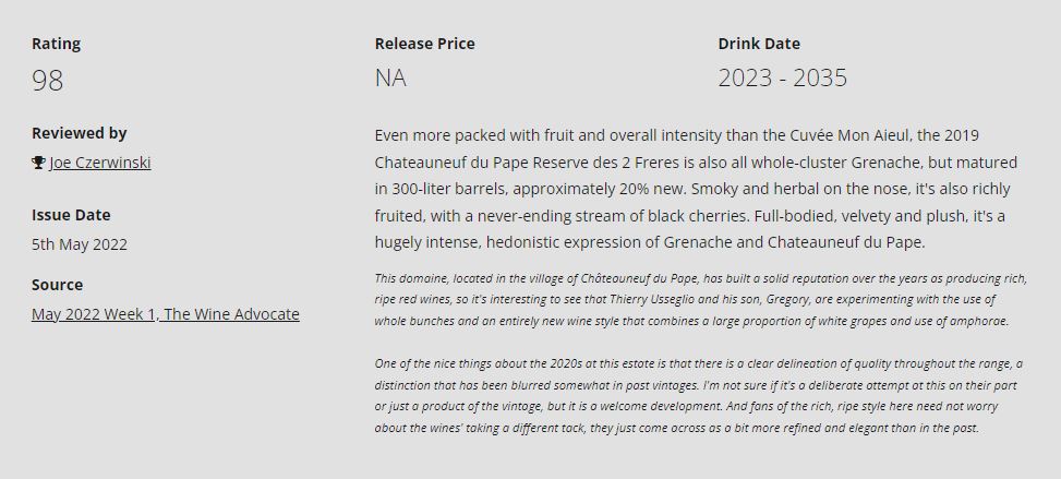 Au cours des deux dernières décennies, il est facile d’inclure le Domaine Pierre Usseglio non seulement parmi les meilleures adresses de Châteauneuf-du-Pape, mais aussi de toute la France. Ils connaissent un succès sensationnel depuis 1998 et n’ont encore jamais commis d’erreur. Cela est particulièrement évident avec ces derniers millésimes 2016, qui sont, à mon avis, les meilleurs vins jamais produits ici. En plus des Châteauneuf-du-Pape, le domaine produit de fabuleux Côtes du Rhône et Lirac, qui sont tous deux exceptionnels.