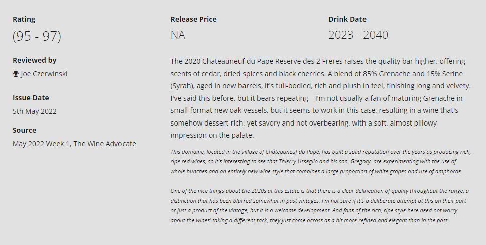 Le Châteauneuf-du-Pape 2020 Réserve Des Deux Frères, dominé par le grenache et comprenant 159 % de syrah, est un autre vin exceptionnel issu de ce domaine remarquable que les lecteurs adoreront.